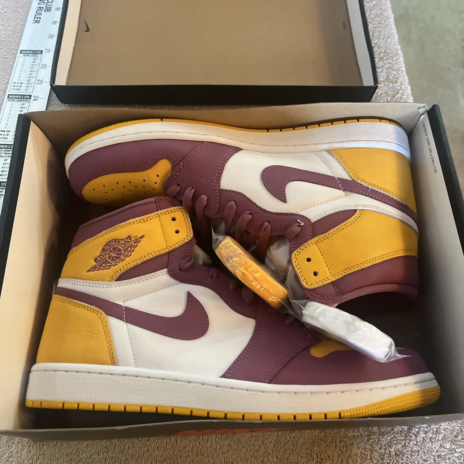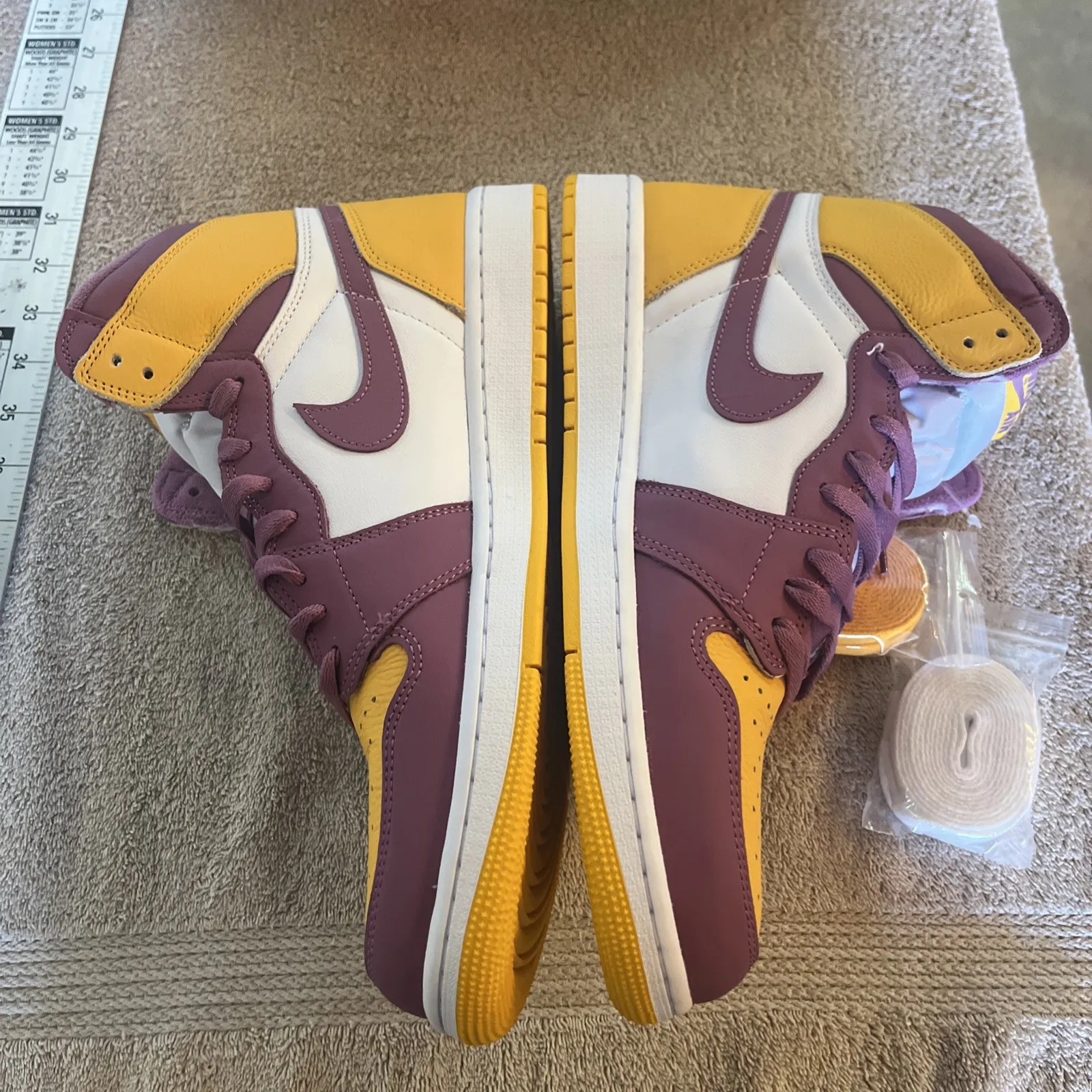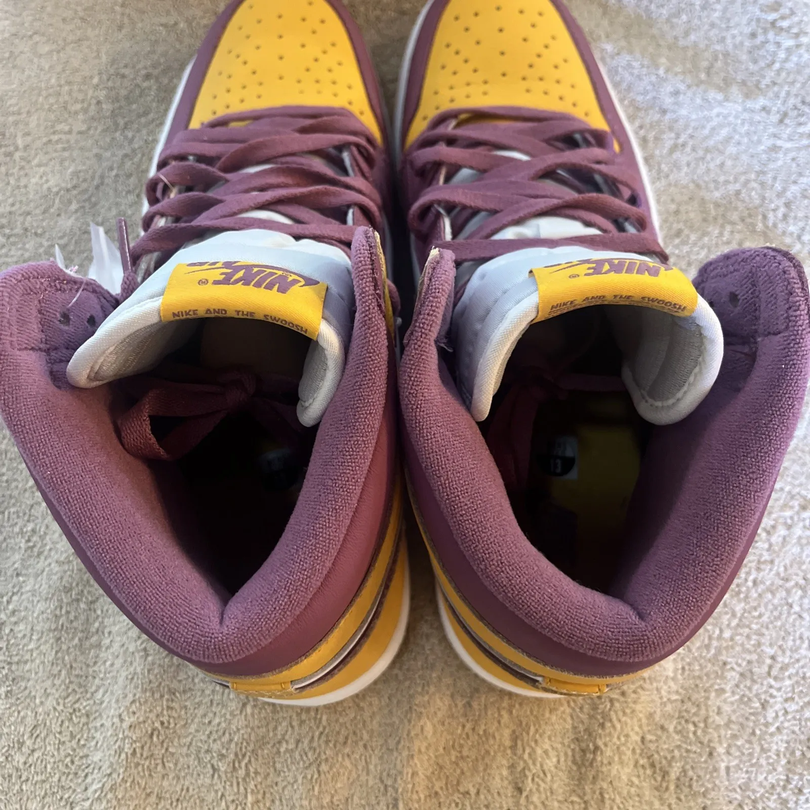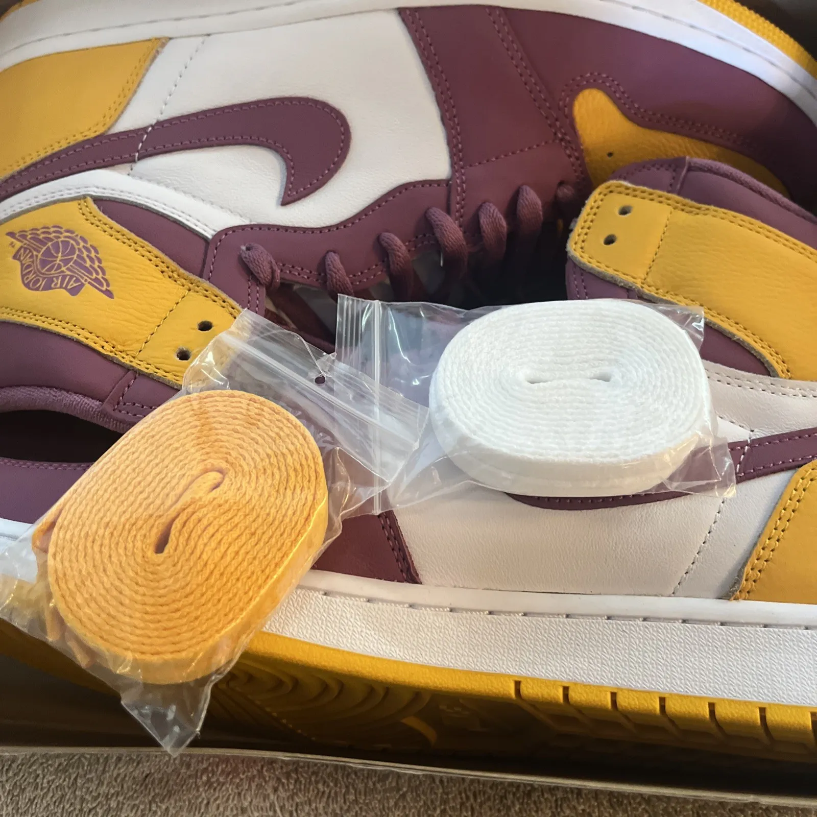 New pair of Air Jordan 1 Retro High OG BrotherHood Basketball shoes. Size 13 US men’s, purple laces already on both shoes and comes with extra set of white and yellow laces. Inserts still in but no protective paper. Shoes look great with no damage or marks. Super fast shipping, see our feedback score!We ship twice a day Monday through Saturday. Under most circumstances items will be shipped the same day.