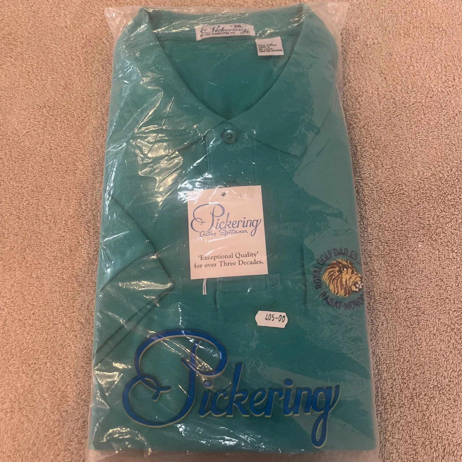 Brand new Pickering by Kimberton Co. golf polo. Turquoise solid color with Royal Golf Dar Es Salam Rabat-Morocco logo. Still in original plastic with tags in excellent condition. Super fast shipping, see our feedback score!We ship twice a day Monday through Saturday. Under most circumstances items will be shipped the same day.