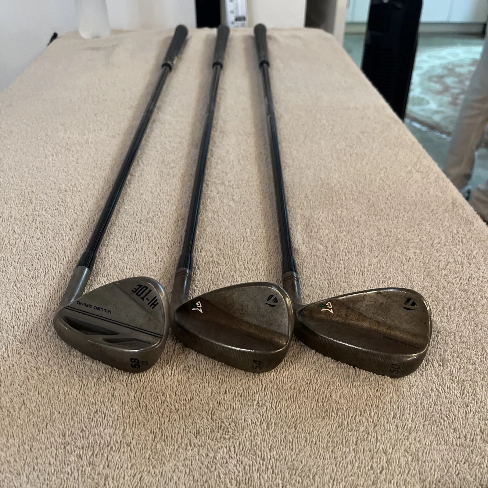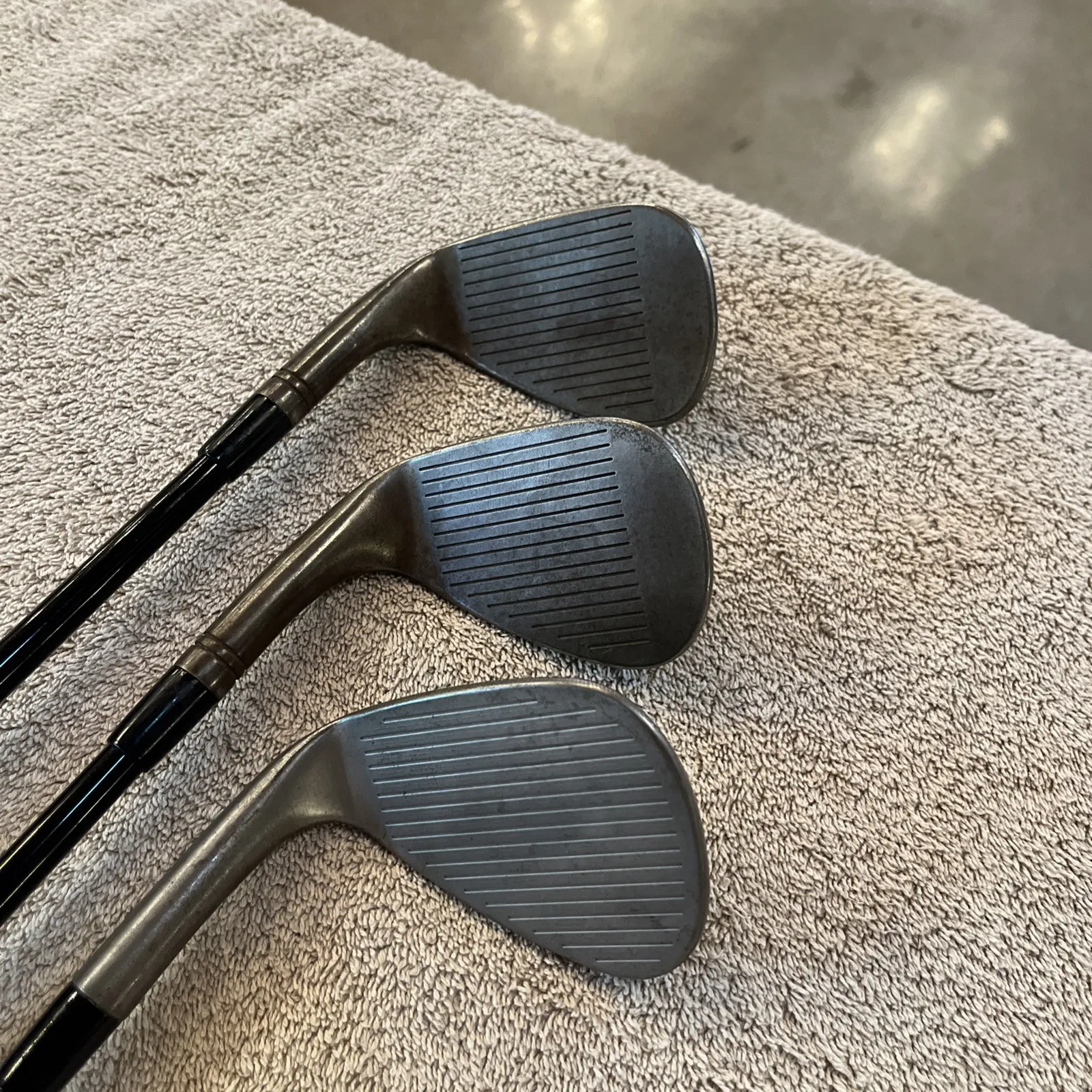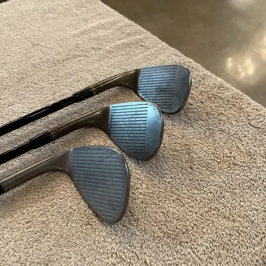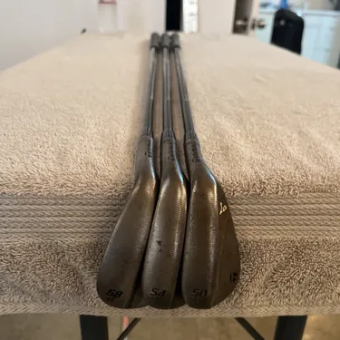 Used set of TaylorMade MG4 tour issue wedges. 58° Hi-Toe 13° bounce, 54° MG4 13° bounce, 50° MG4 9° bounce. All with Mitsubishi chemical MMT 105g stiff flex wedge shafts, golf Pride corded tour velvet standard grips. Clubs in great condition, used but faces and grooves have been cleaned. Clubs have rusted finish so they look dirty. These are tour issue wedges with rare shafts, turned and polished ferrules. Super fast shipping, see our feedback score!We ship twice a day Monday through Saturday. Under most circumstances items will be shipped the same day.