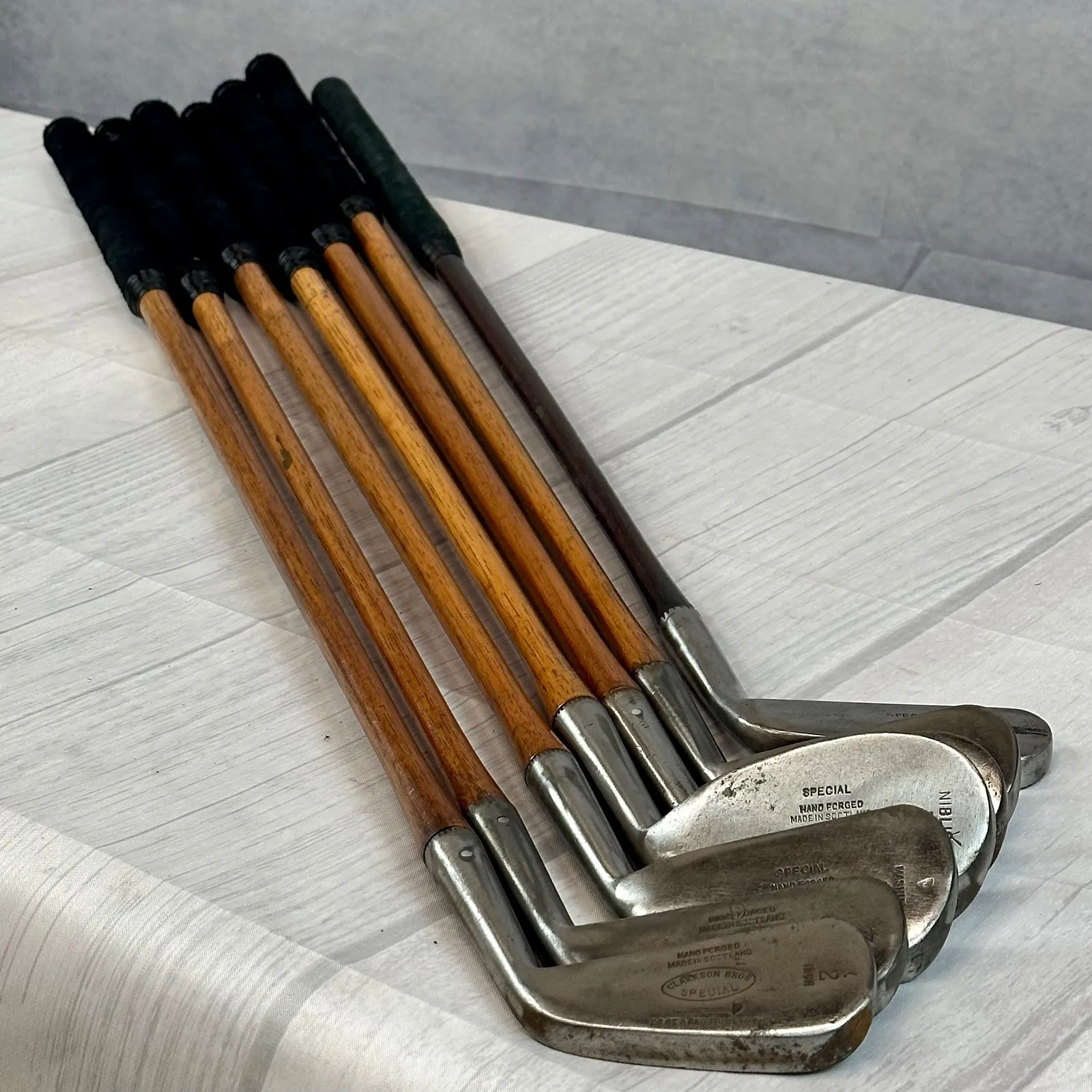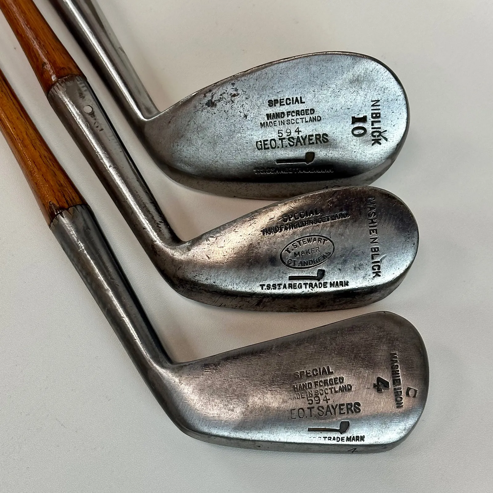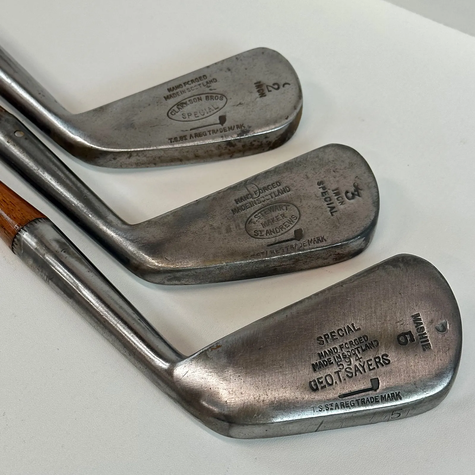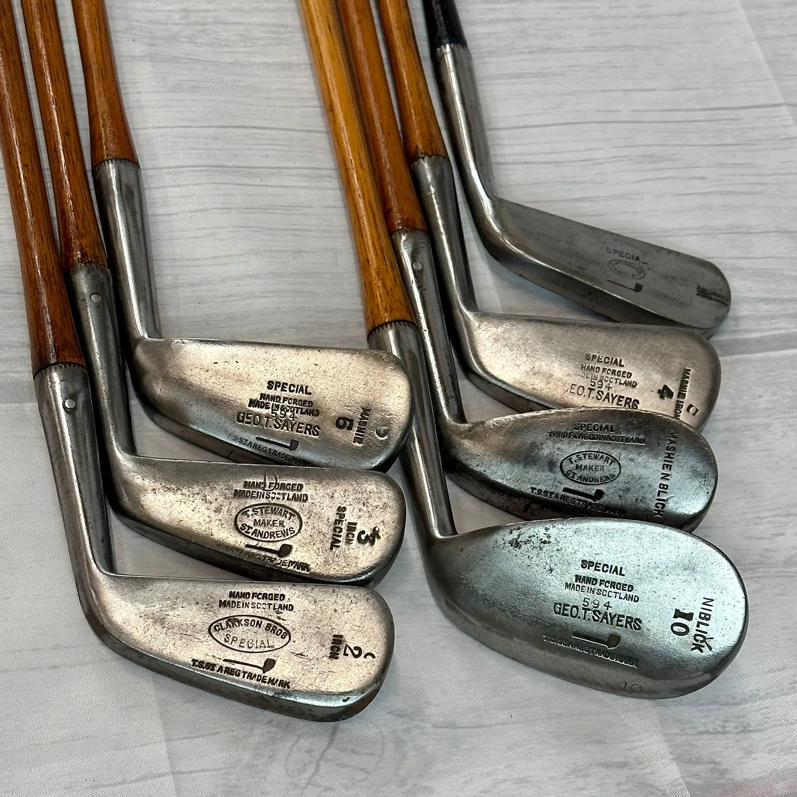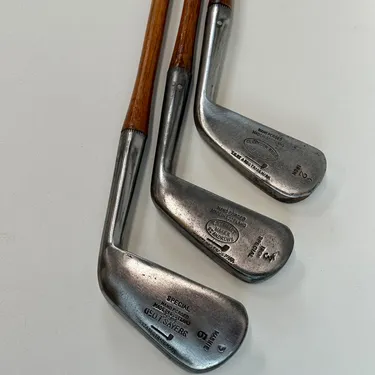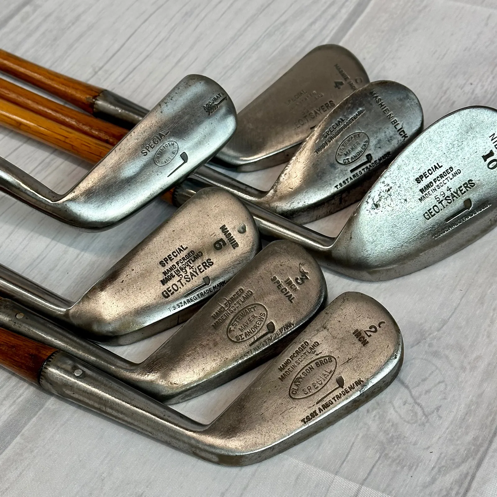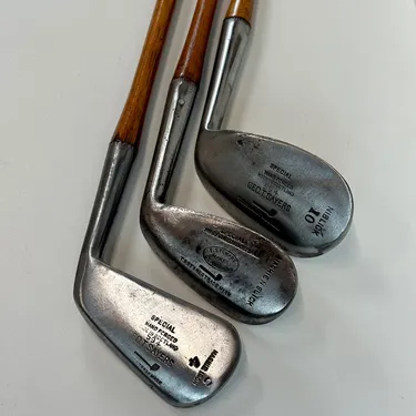 2,3 Irons. 4 Geo Sayers Mashie Iron, 6 Mashie, Mashie Niblick, Niblick and Special Putter. Made in Scotland - St. Andrews. All heads reset for play by professional hickory smith, re-pinned, most with original shafts, new leather grips, and whipping.