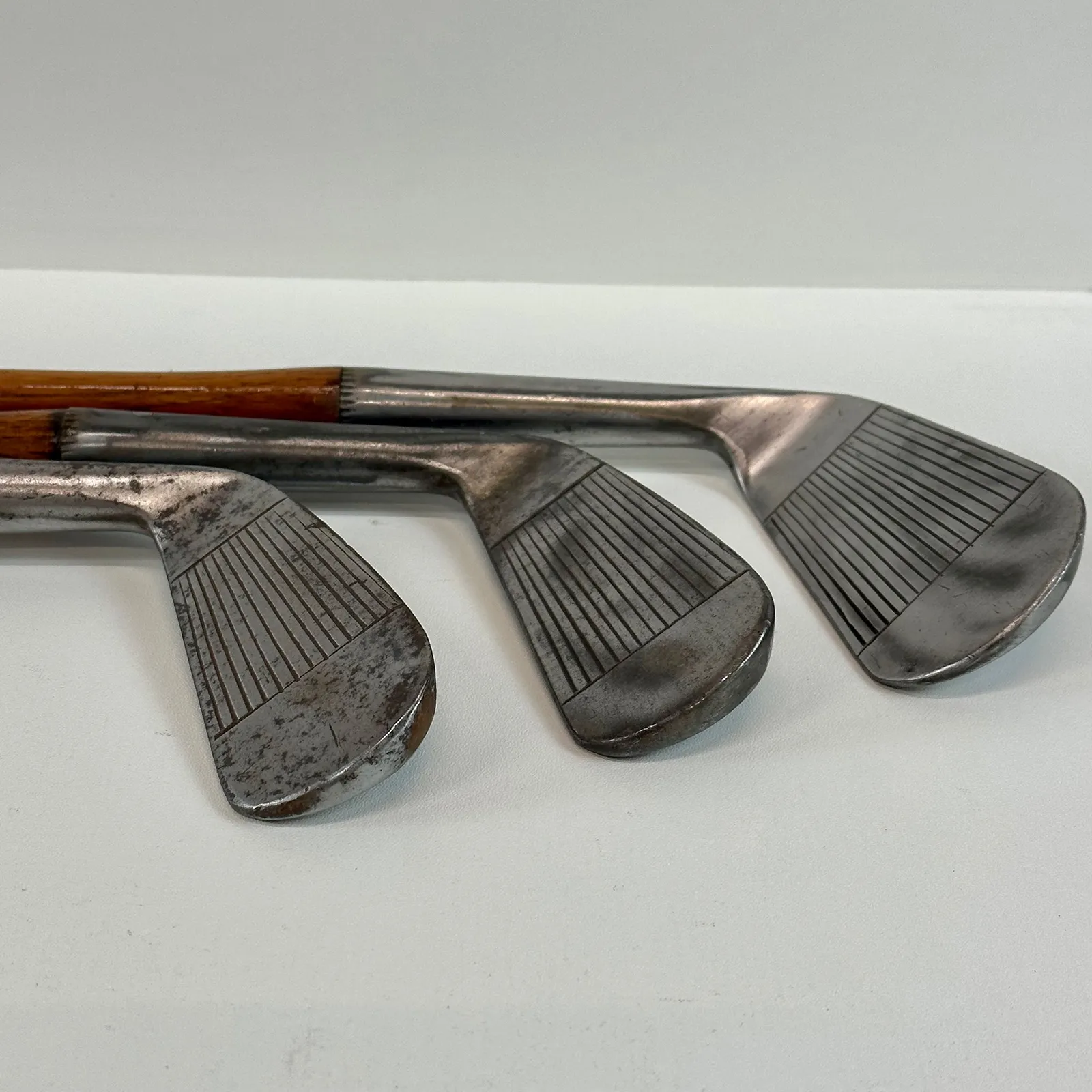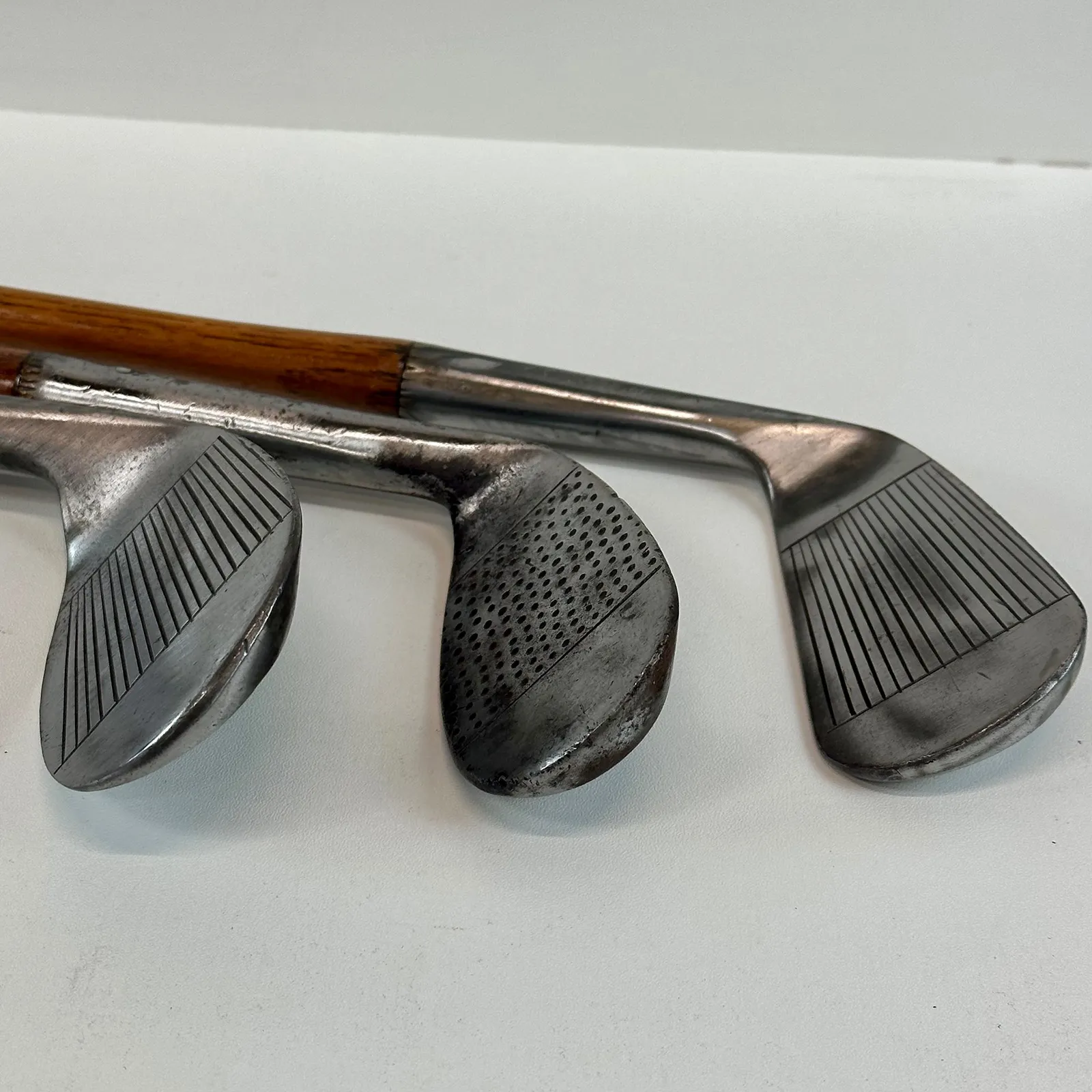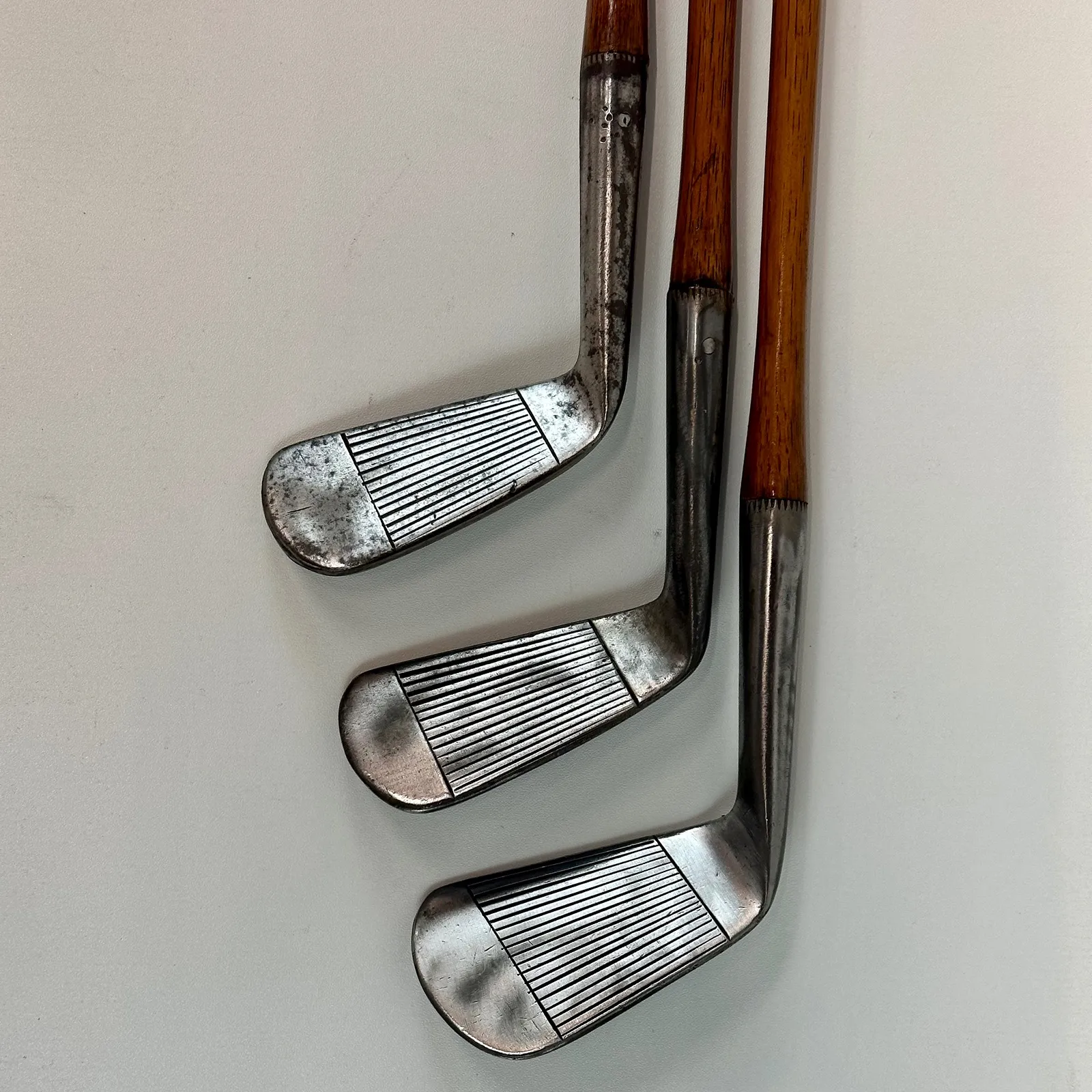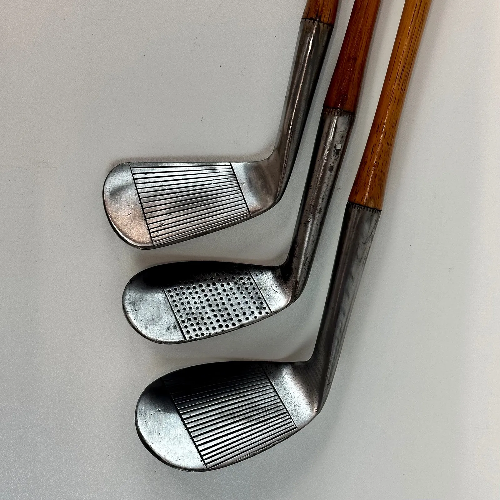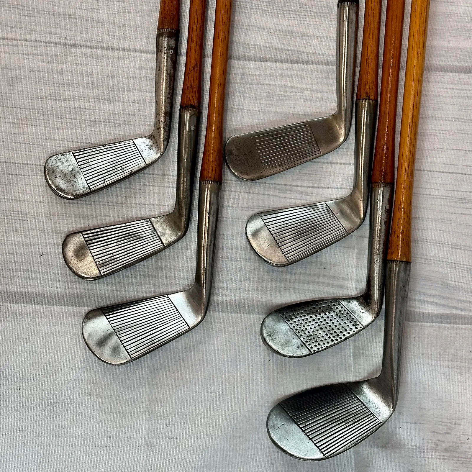 2,3 Irons. 4 Geo Sayers Mashie Iron, 6 Mashie, Mashie Niblick, Niblick and Special Putter. Made in Scotland - St. Andrews. All heads reset for play by professional hickory smith, re-pinned, most with original shafts, new leather grips, and whipping.