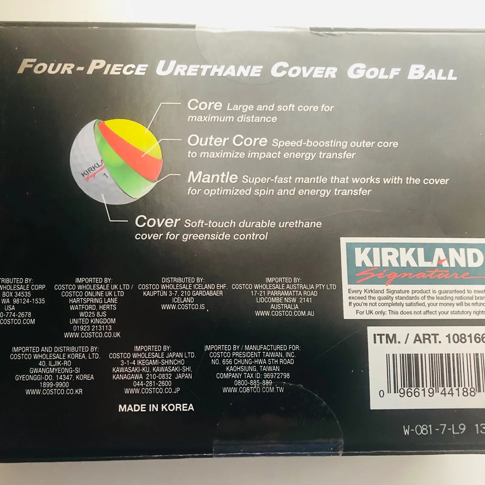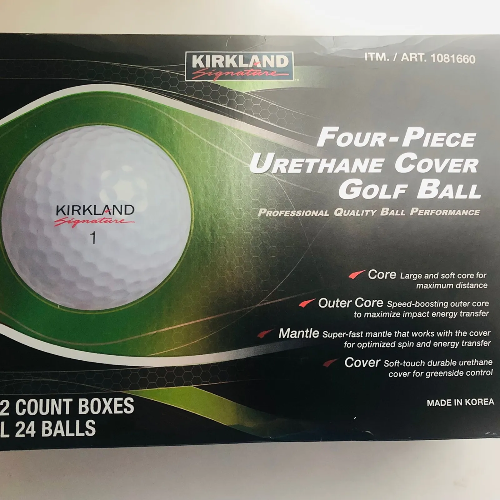The legendary K Sig. The Kirkland Signature Four-Piece Urethane Cover Golf Ball features professional quality ball performance! This four-piece, tour quality ball is encased in a urethane cover, providing a very soft feel, so you won’t have to trade distance for “feel” anymore. The quality construction provides a controlled iron spin, consistent ball flight, excellent green-side control and lasting durability. Kirkland Signature Tour Performance’s speed boosting outer core is engineered to maximize the impact energy transfer for all high and low swing players. Titleist sued Costco over these golf balls. No longer available, if you know you know!