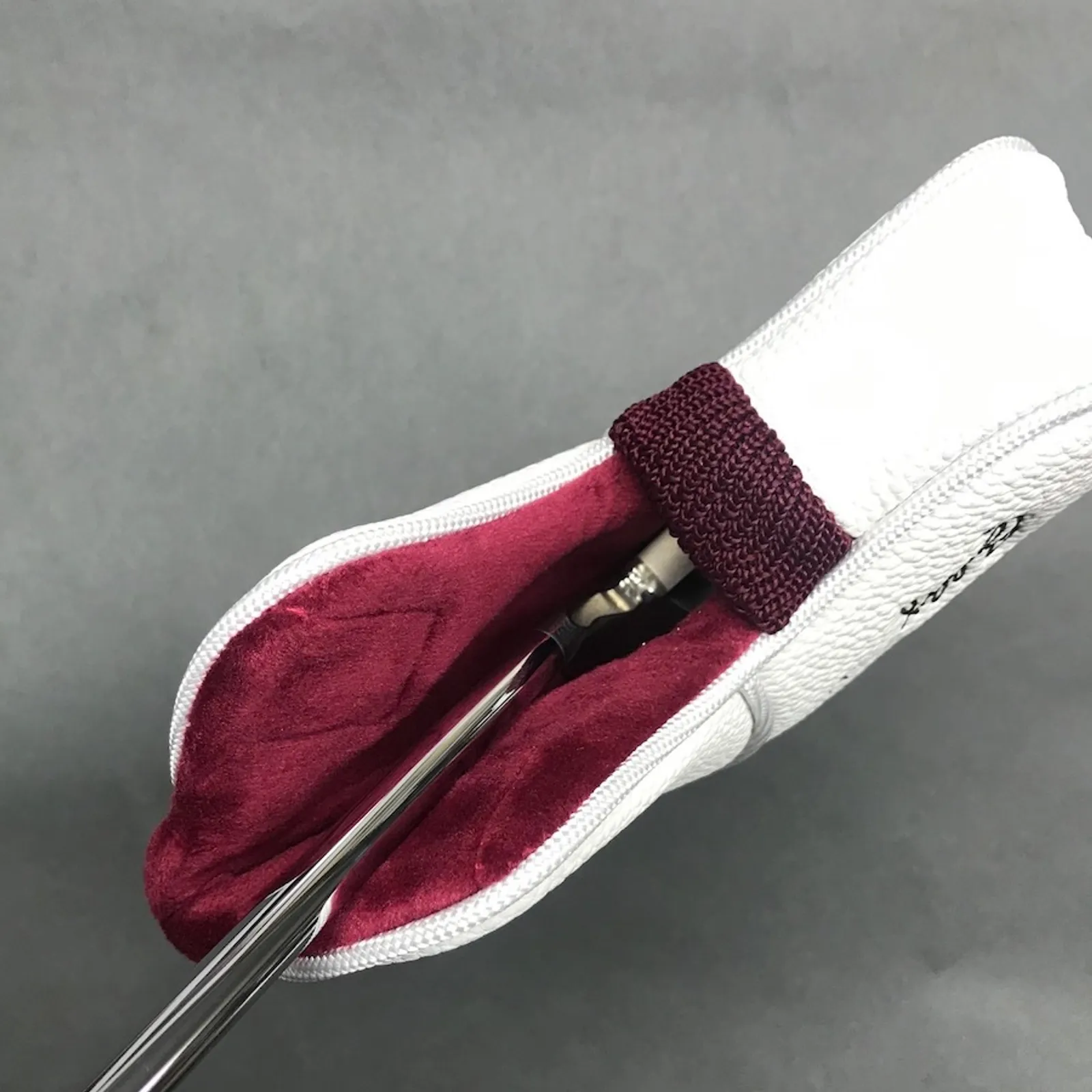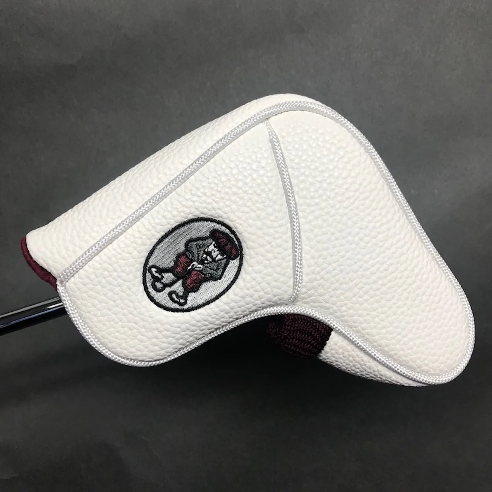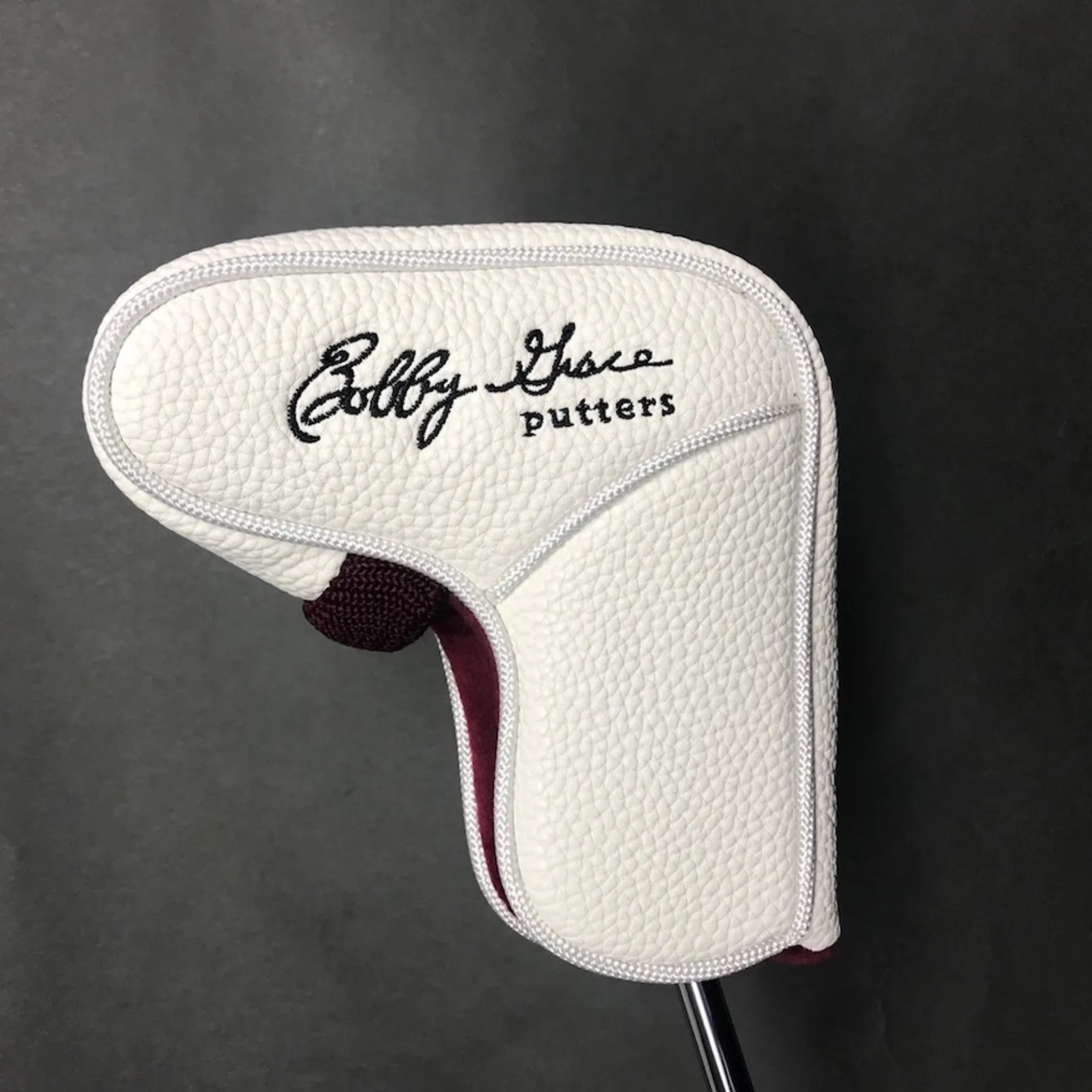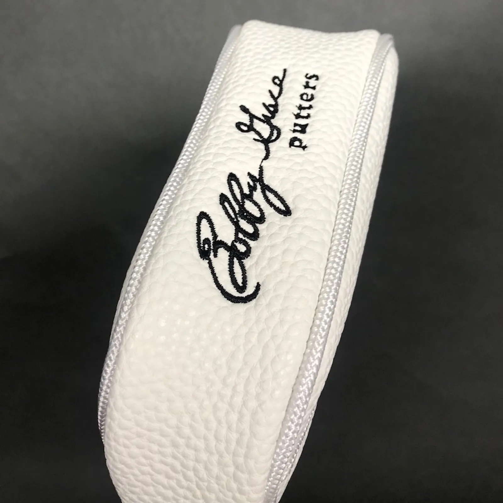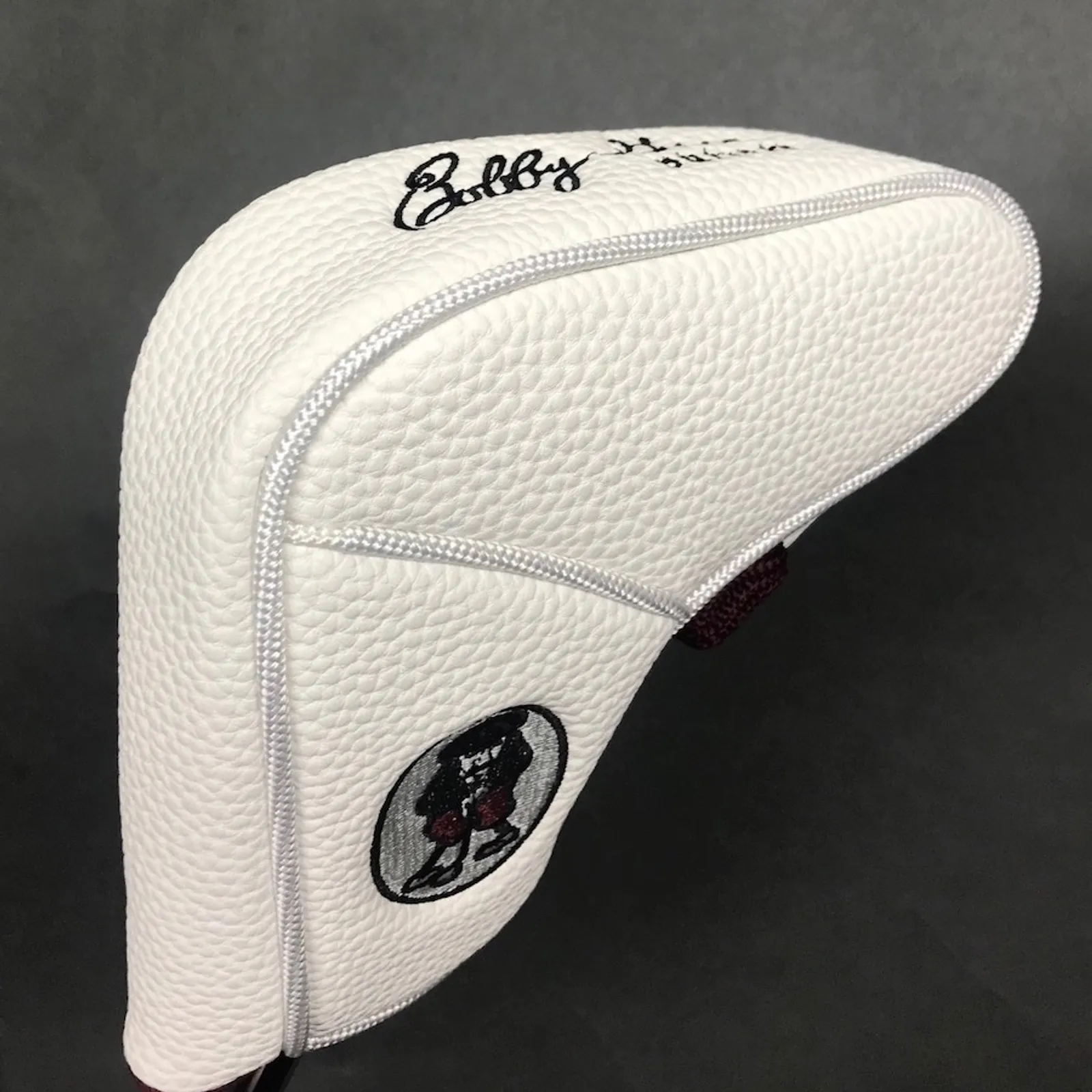Brand new Bobby Grace Magnetic Blade Headcover. New for this year is this long-awaited Custom White durable blade headcover with a very strong magnetic enclosure. Embroidered with our famous Knickerbocker Logo and my signature, this one will surely last a long time. Fits all Shiloh models, Jericho, Center Cut, 18 Blade, Lo Pro, Crossbow, 6330, and 6313. $30.00 plus $8 shipping inside the USA only.